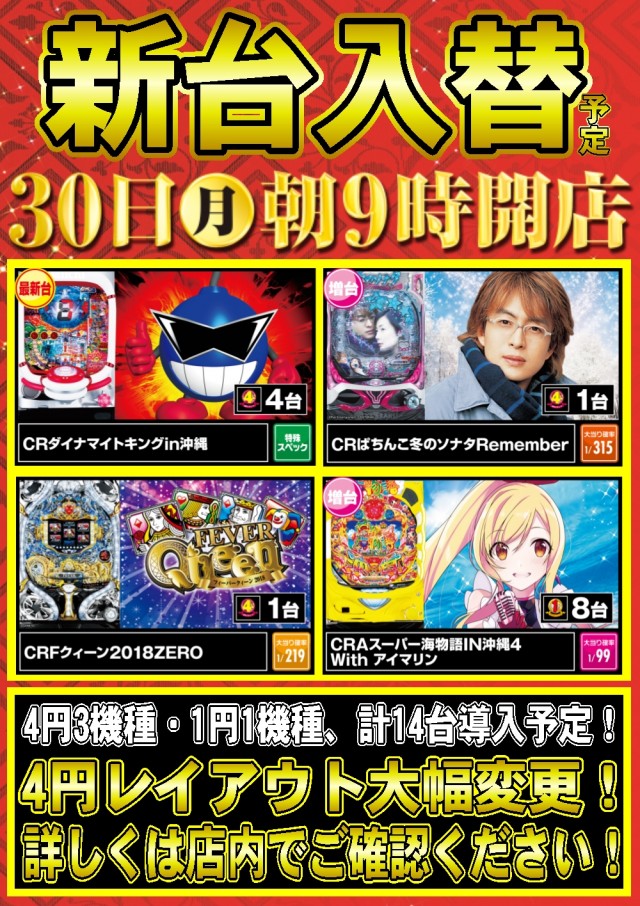 【名寄店】7月30日(月)新台入替(予定)!