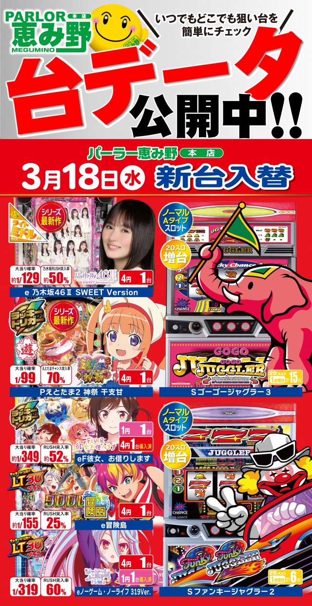 本日新台入替★新台7機種導入予定★朝9時開店★