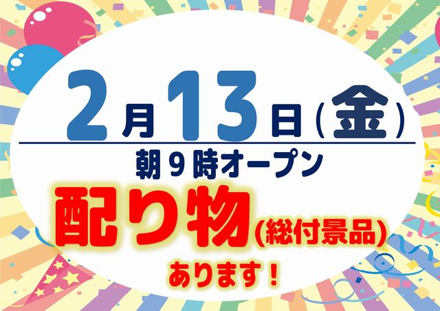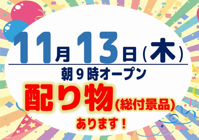 本日朝9時開店★配り物あります!(総付景品配布予定)