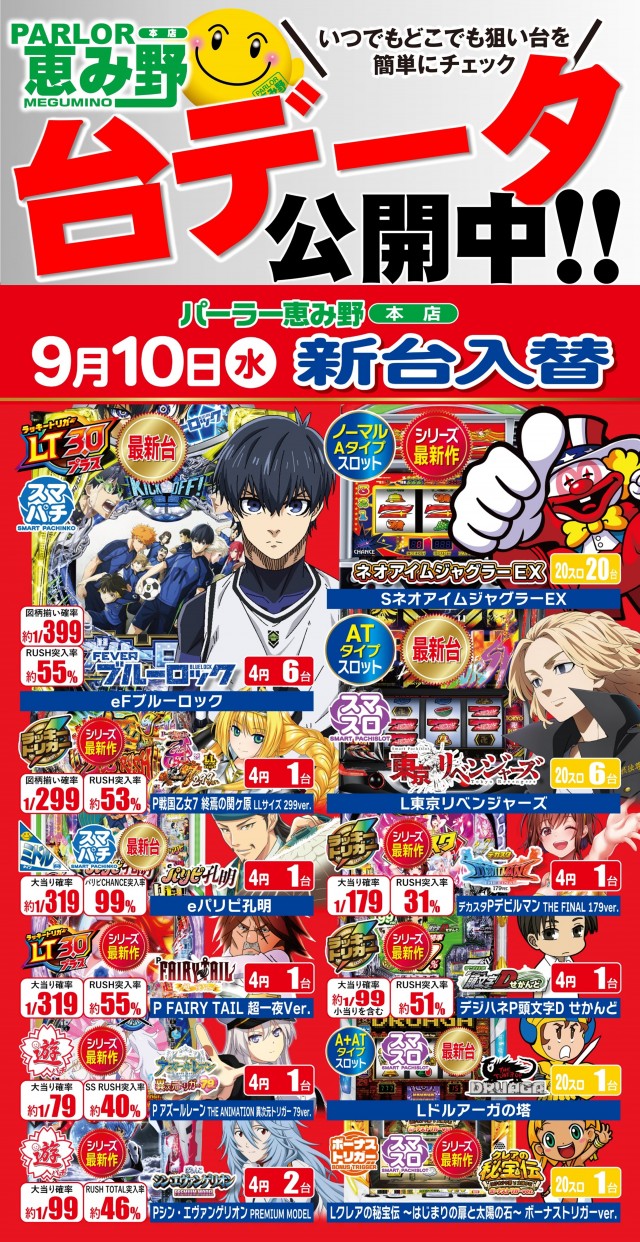 本日朝9時開店★今週の新台8機種導入済★台データ公開中♪