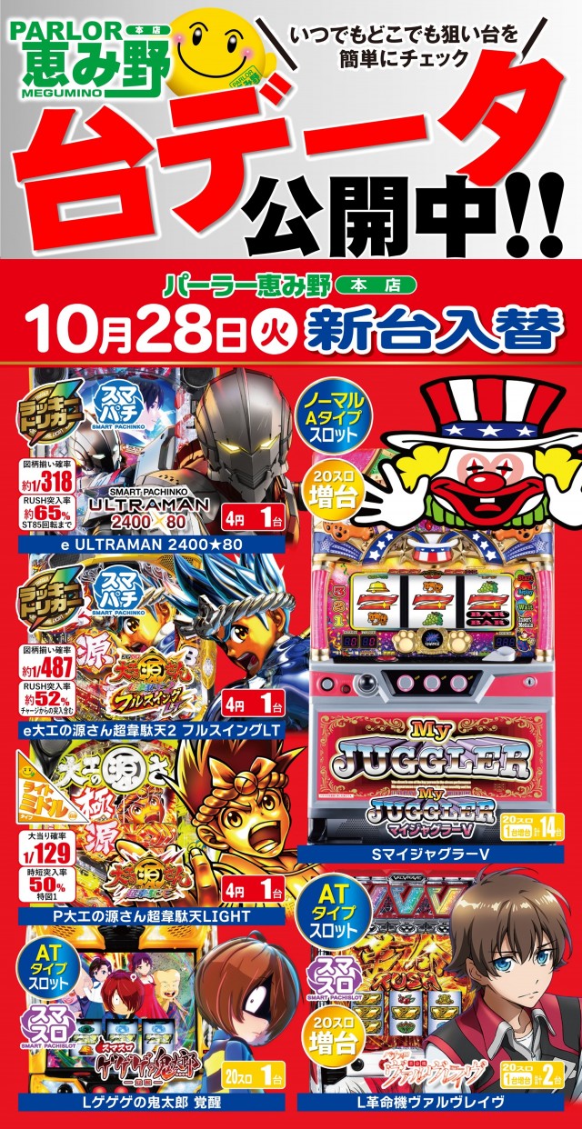 本日朝9時開店★今週の新台7機種導入済★台データ公開中♪