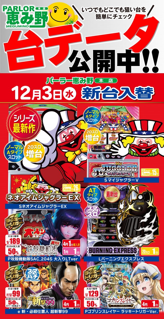 明日朝9時開店★今週の新台4機種導入済★台データ公開中♪