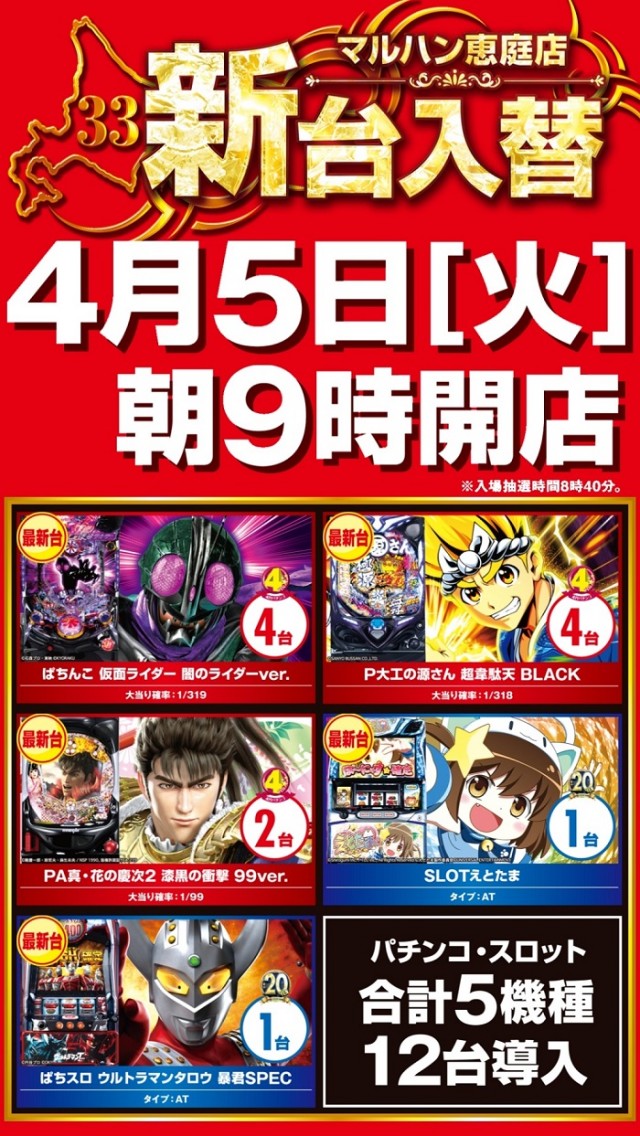 4月5日(火)新台入替9時開店 入場抽選8時40分