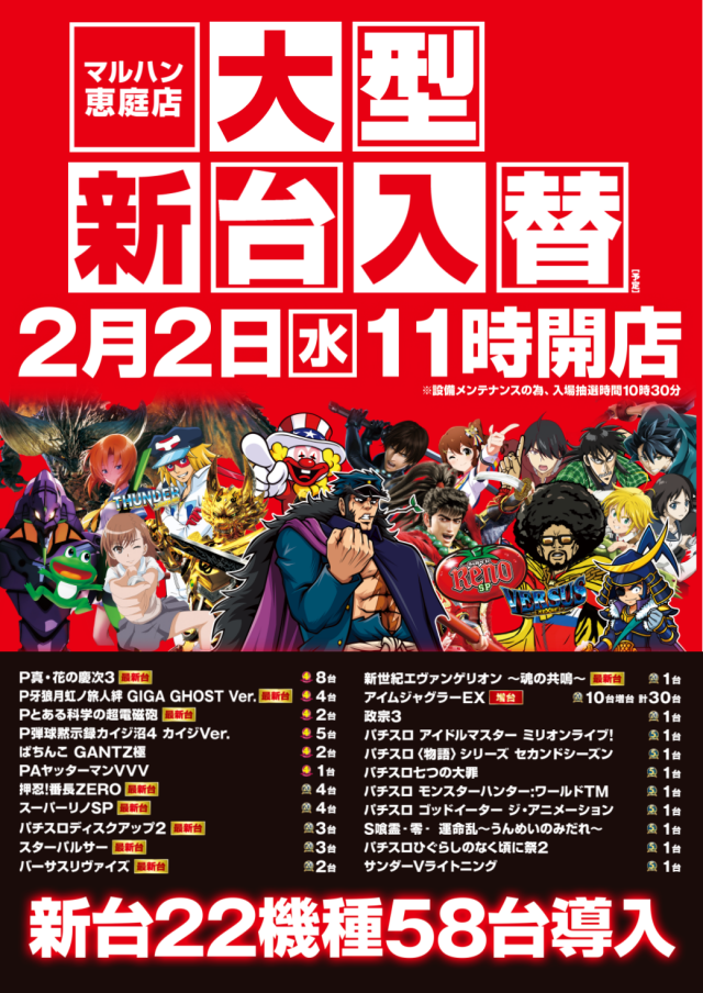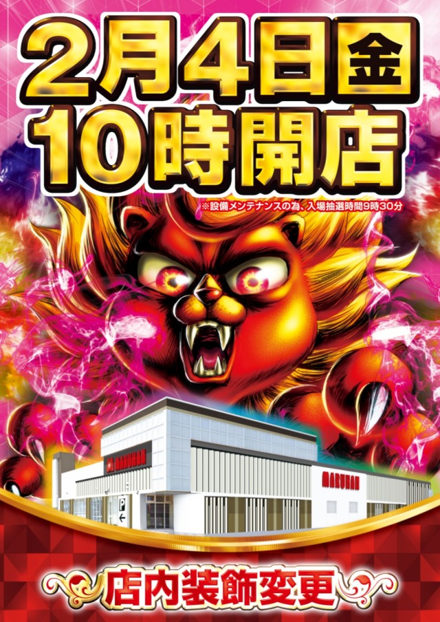 明日2日(水)11時開店!★設備メンテナンス★大型新台入替★