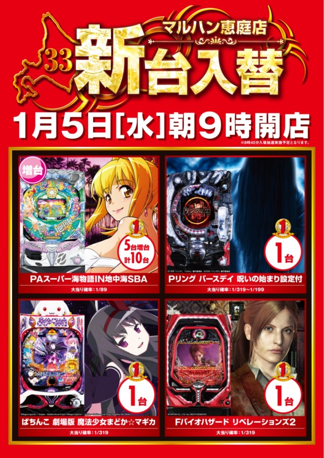 1月5日(水)★新台入替★ 朝9時開店♪