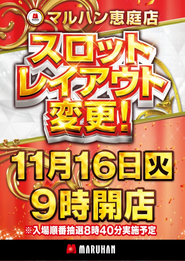 明日16日(火)スロットレイアウト変更★朝9時開店