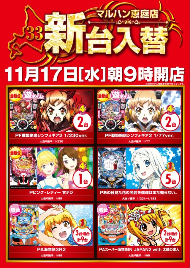 11月17日(水)★新台入替★朝9時開店