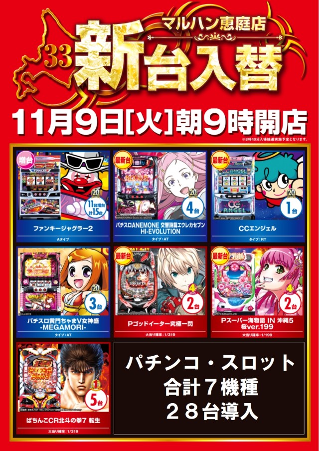 11月9日(火)★新台入替★朝9時開店