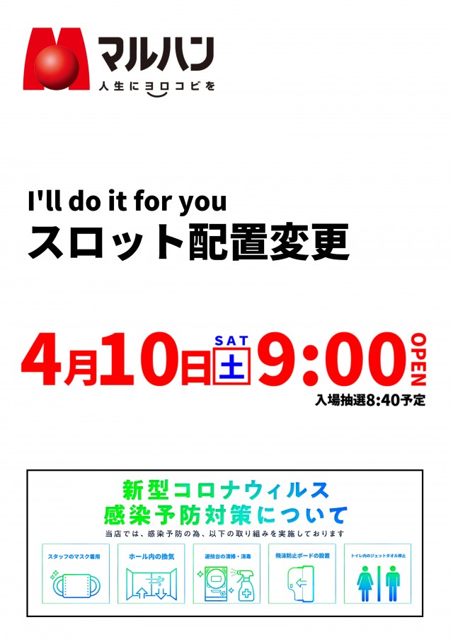 明日10日(土)9時開店(入場抽選8:40)スロット配置変更