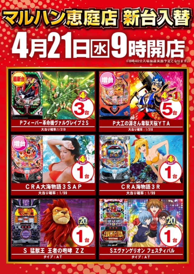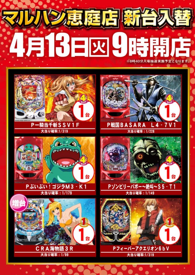 3月30日(火)新台入替★朝9時開店(入場抽選8:40)