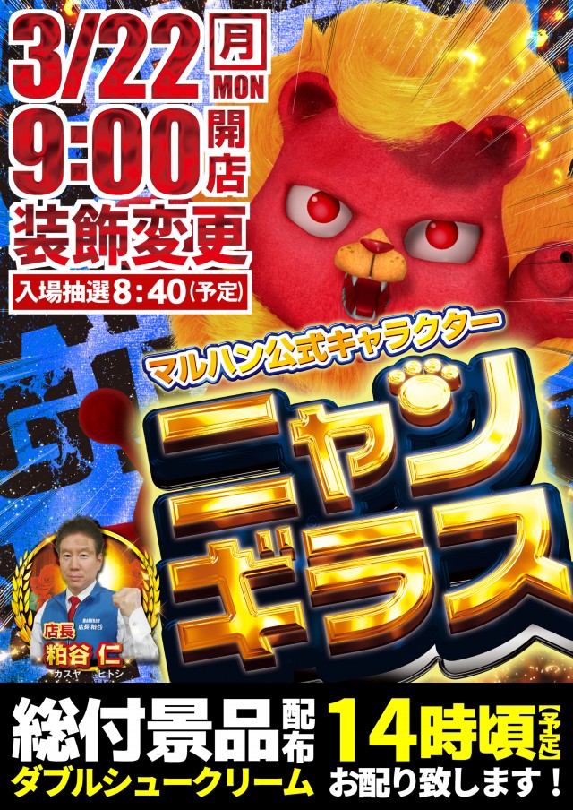 3月22日(月)朝9時開店 装飾変更 総付景品シュークリーム
