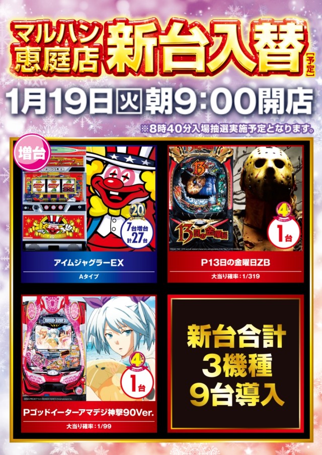 明日1月27日(水)新台入替!朝9時開店♪入場抽選は8:40