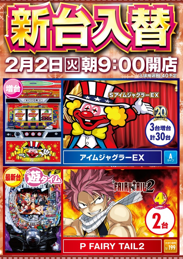 明日2月2日(火)新台入替(予定) 朝9時開店!