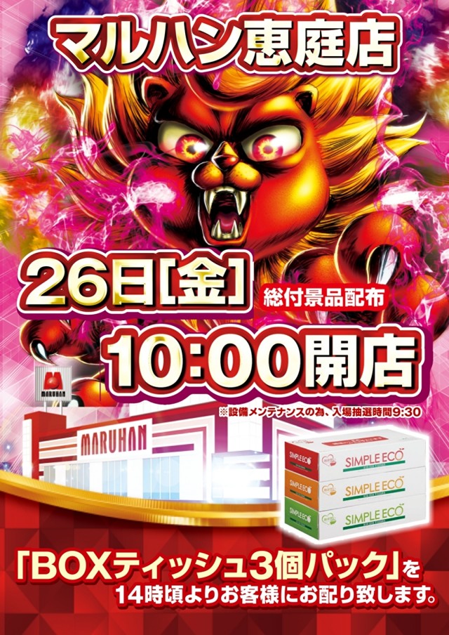 明日11月26日(木)新台入替 朝9時開店