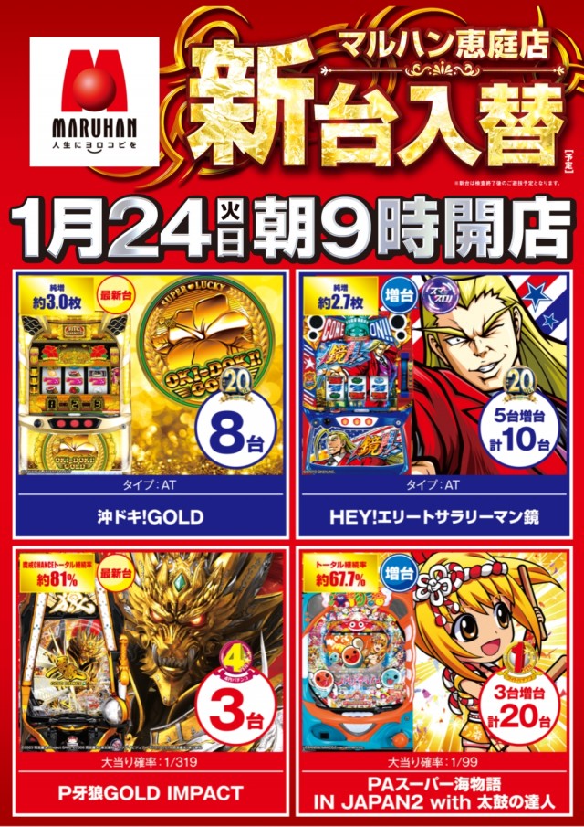 24日(火)朝9時開店★新台入替&スロットレイアウト変更★