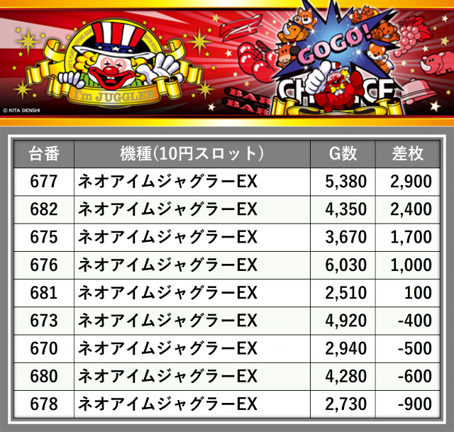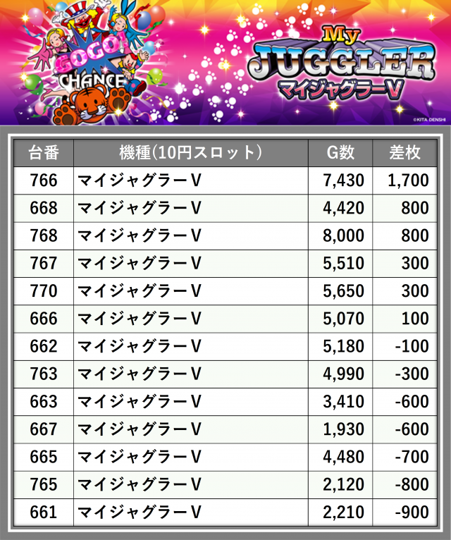 厳選された取材対象機種をはじめ、その他スロット全体から好記録が飛び出した!プレイヤーが楽しんだ1日を下記データにて振り返ってみて欲しい。