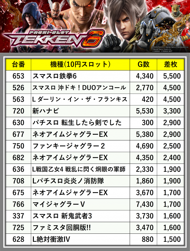 ※差枚数順に掲載しています