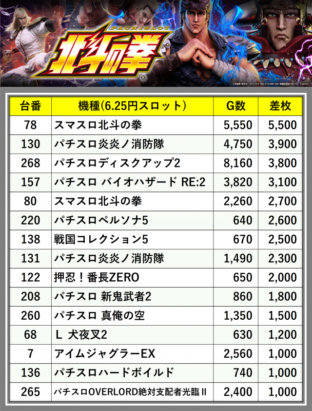 厳選された取材対象機種をはじめ、その他スロット全体から好記録が飛び出した!プレイヤーが楽しんだ1日を下記データにて振り返ってみて欲しい。