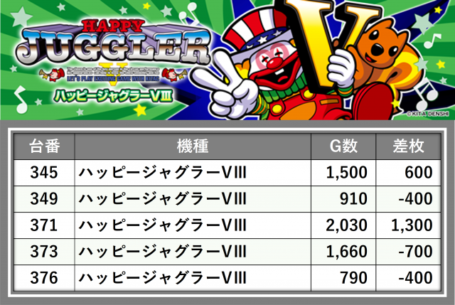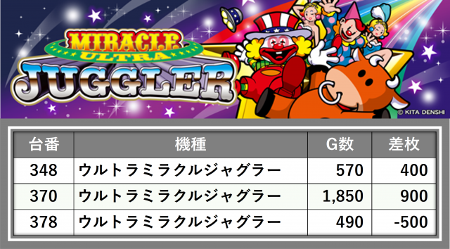 厳選された取材対象機種をはじめ、その他スロット全体から好記録が飛び出した!プレイヤーが楽しんだ1日を下記データにて振り返ってみて欲しい。