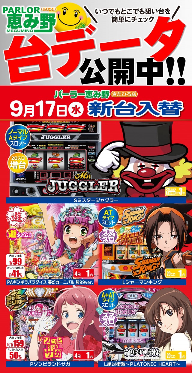 本日朝9時開店★今週の新台6機種導入済★台データ公開中♪