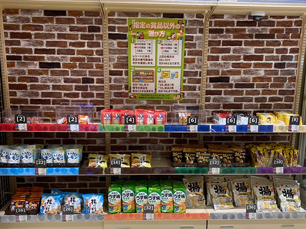 景品コーナーにはお菓子が多数用意されており、スナック好きにはたまらない品揃えといえるだろう。