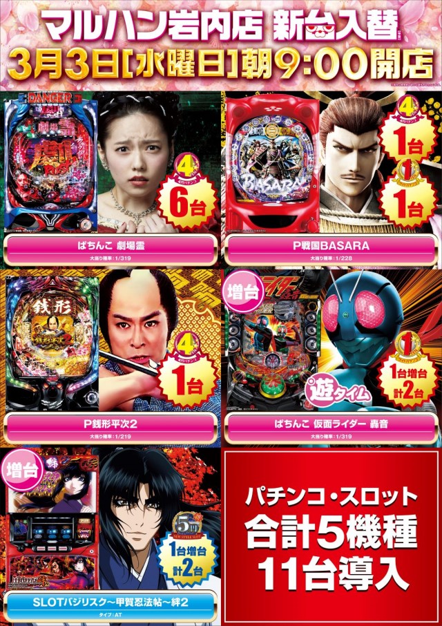 3月3日【水】新台入替!朝9時開店♪