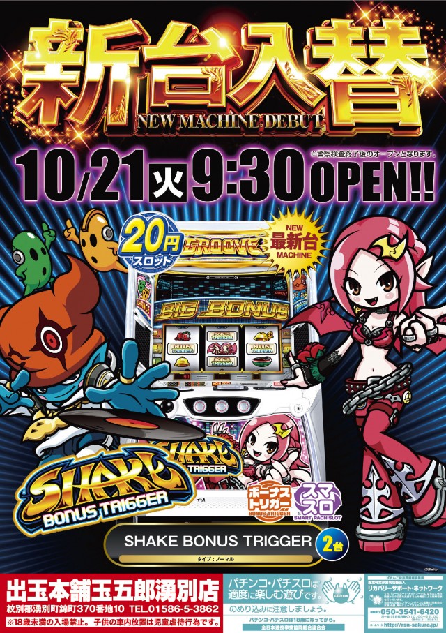 本日新台入替!9:30開店!最新台シェイクBT2台導入☆☆