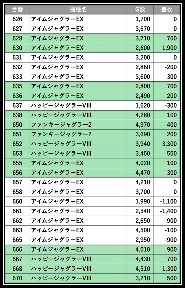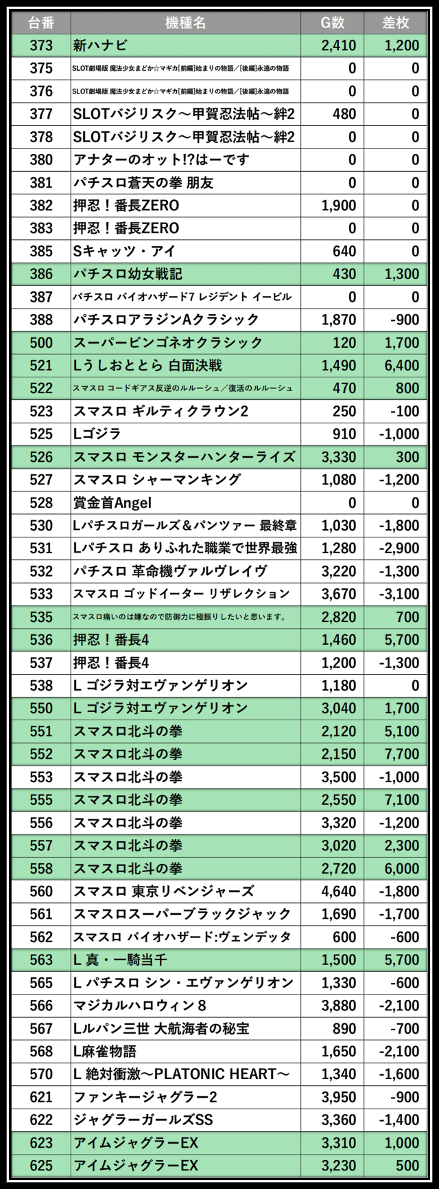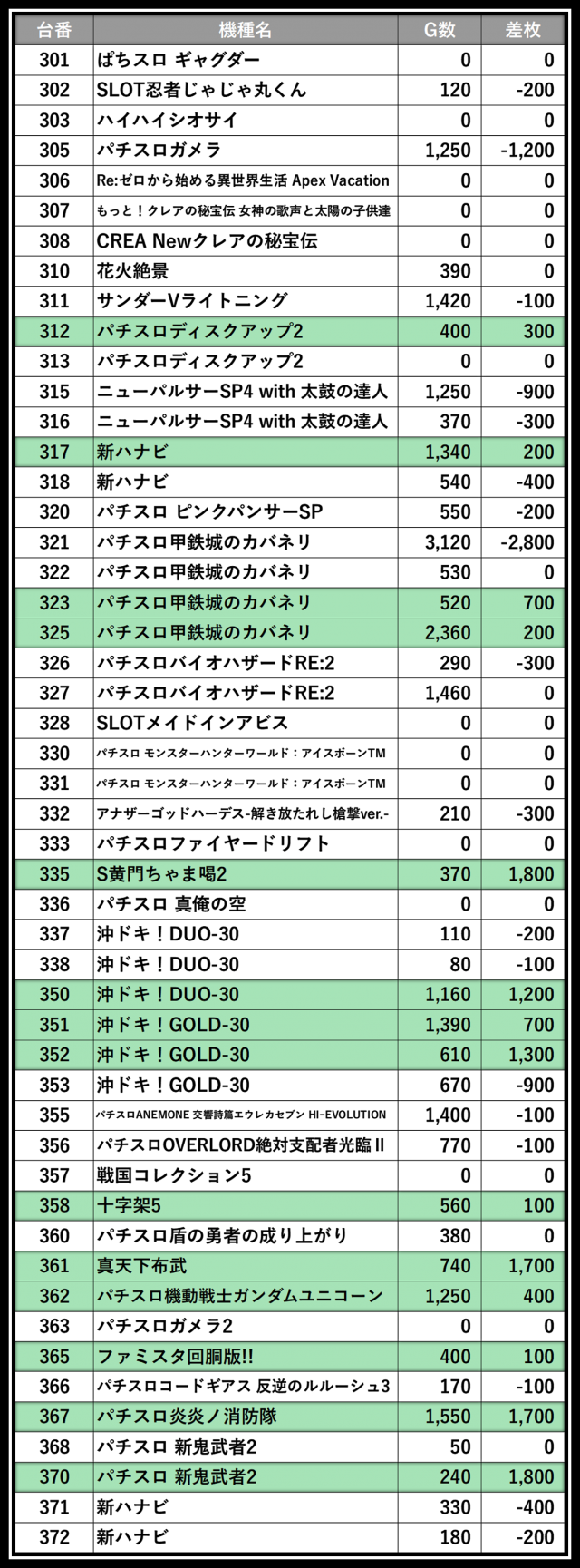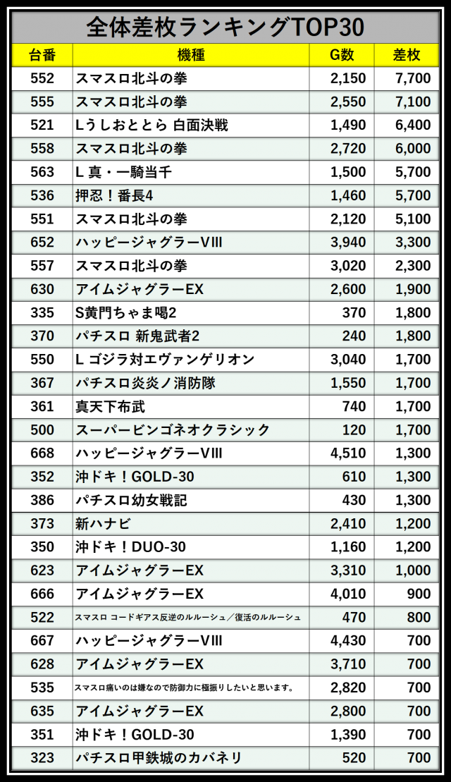 ※差枚数順に掲載しています