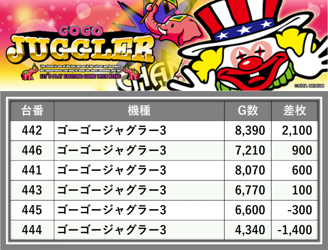 厳選された取材対象機種をはじめ、その他スロット全体から好記録が飛び出した!プレイヤーが楽しんだ1日を下記データにて振り返ってみて欲しい。
