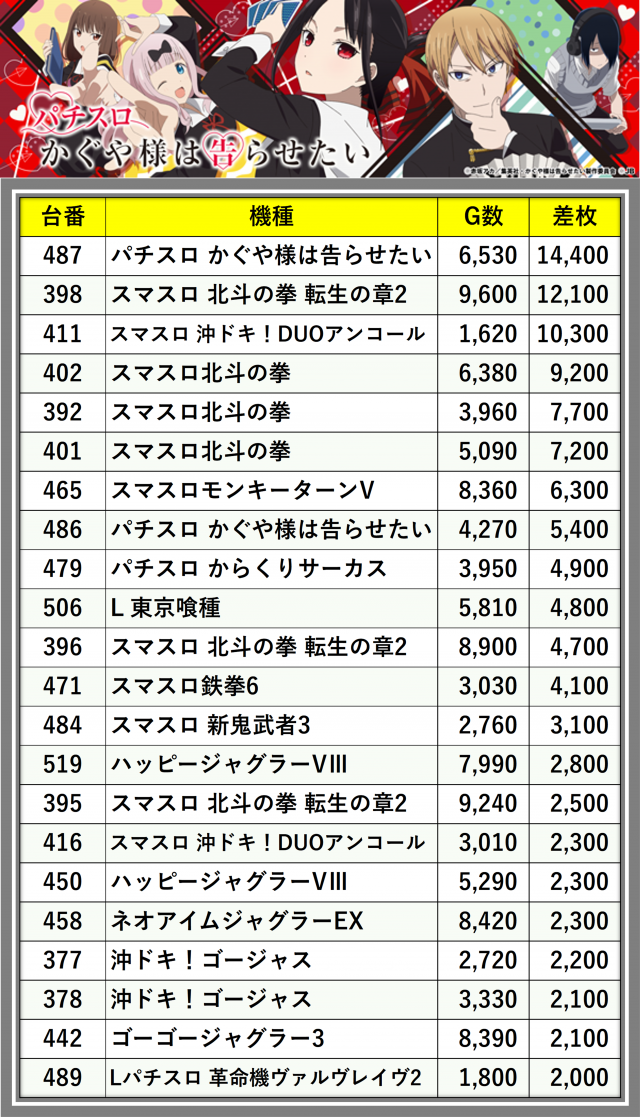 ※差枚数順に掲載しています