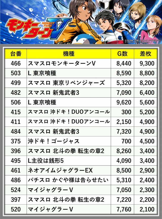 ※差枚数順に掲載しています