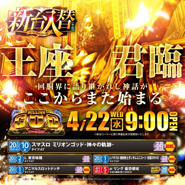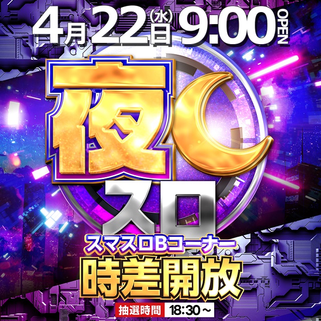4月22日(水)9時開店!新台入替(予定)&夜スロ時差開放