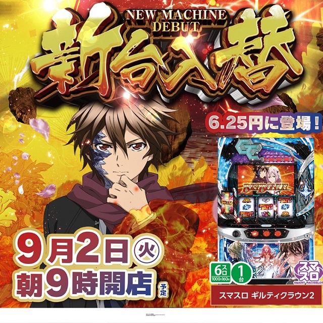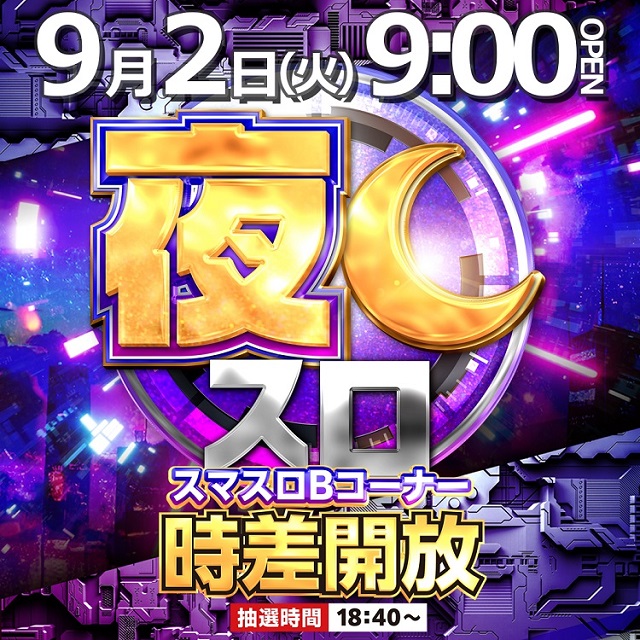 9月2日(火)9時開店!夜スロ!スマスロBコーナー時差開放!