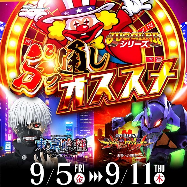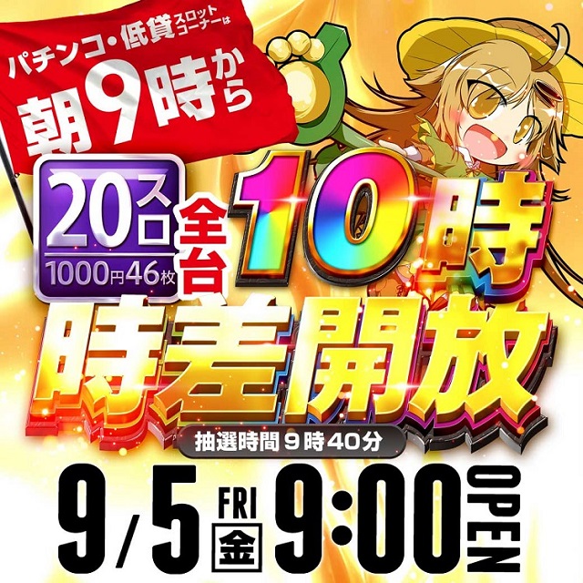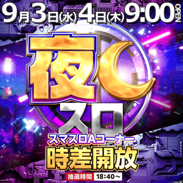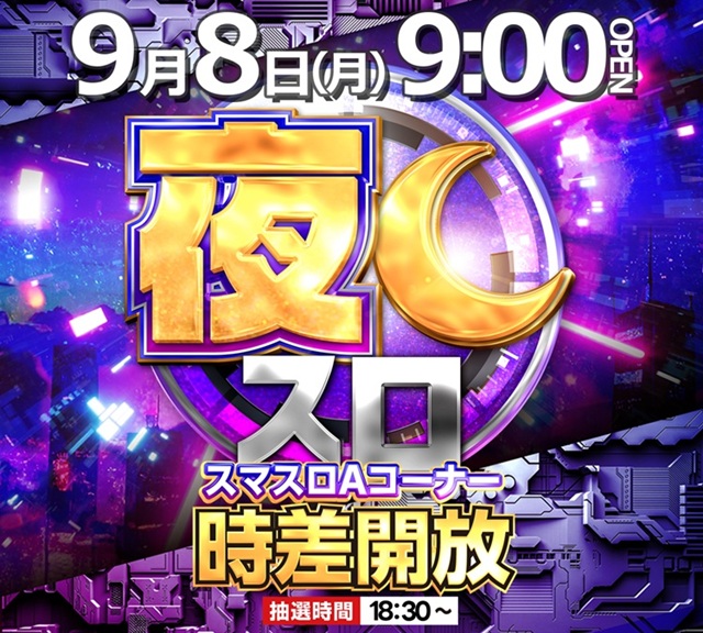 9月4日(木)9時開店!夜スロ!スマスロAコーナー時差開放!