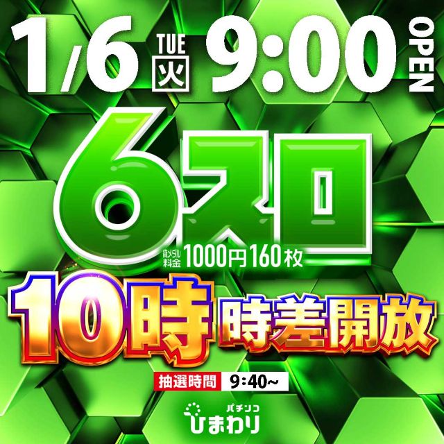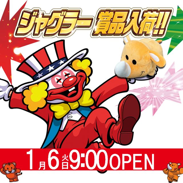 1月6日(火)9時開店!ジャグラー賞品入荷&6スロ10時時差