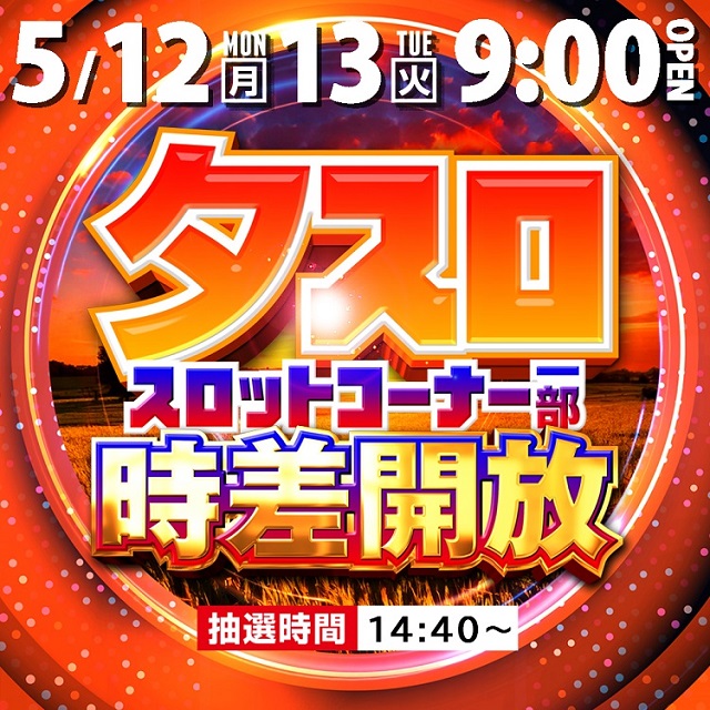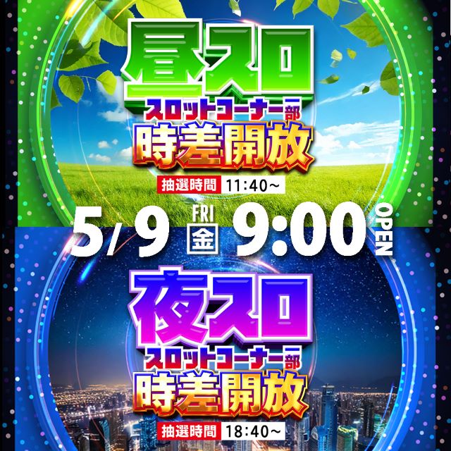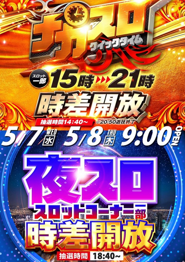 5月7日(水) 9時開店! ナカスロ&夜スロ時差開放!