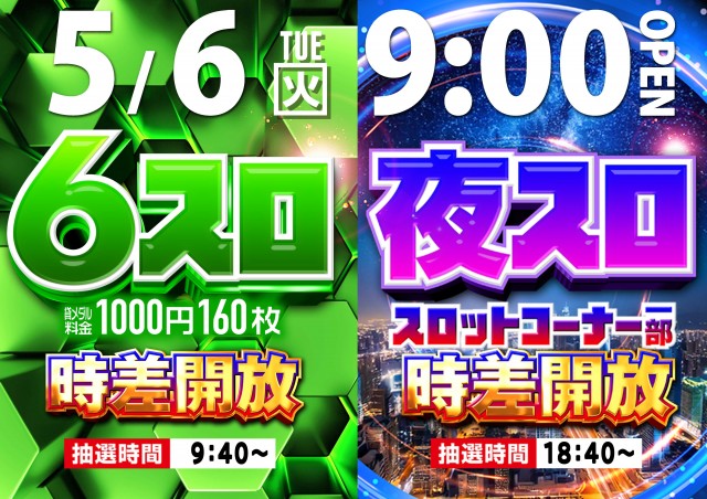 5月6日(火)9時開店!6スロ10時時差開放&夜スロ!