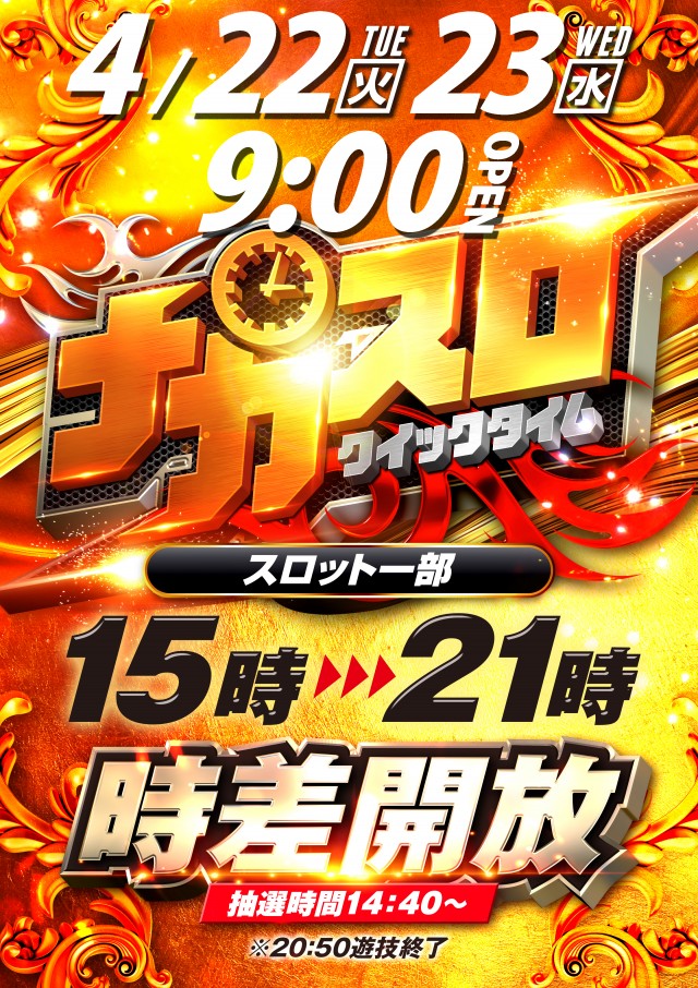 4月23日(水)9時開店☆新台入替&ナカスロクイックタイム☆