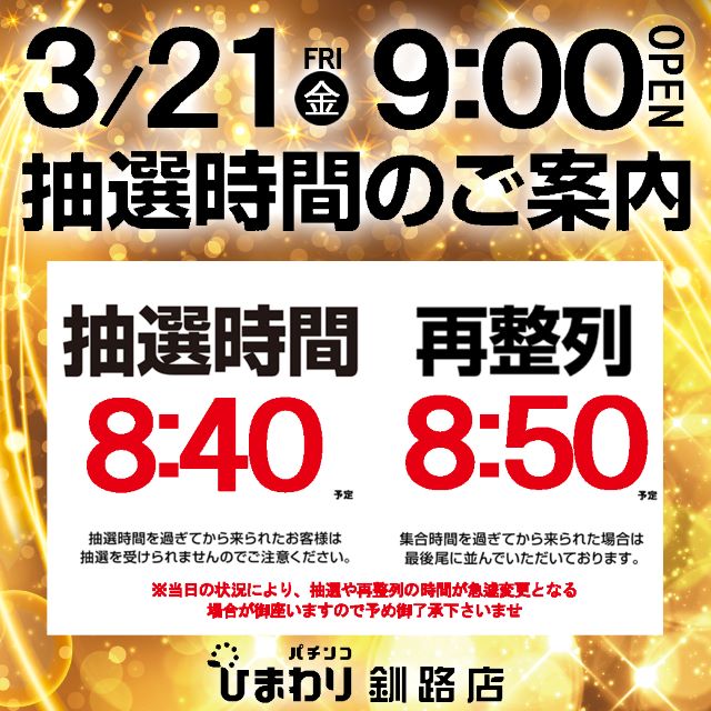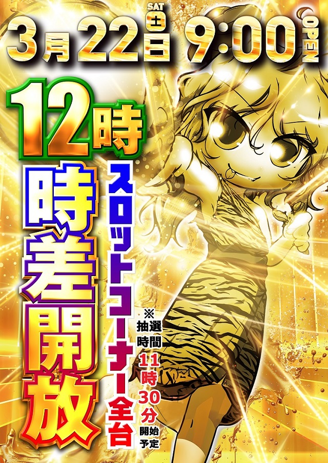 3月22日(土)9時開店 金ひな取材&スロット12時時差開放