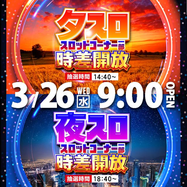 3月26日(水)9時開店! ☆6スロ10時☆夕スロ★夜スロ★