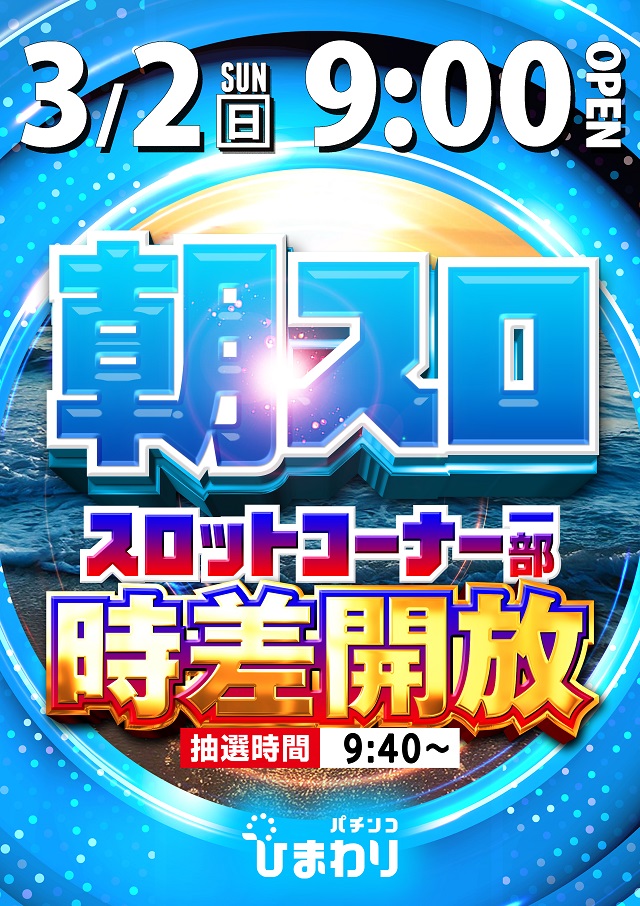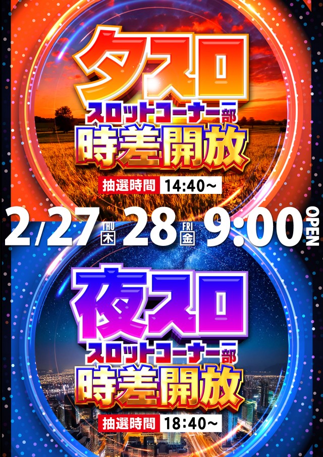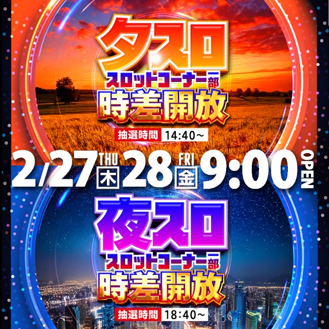 2月28日(金) 9時開店! 夕スロ&夜スロ時差開放!!
