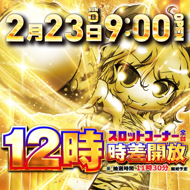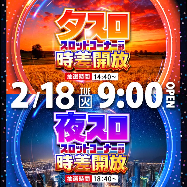 2月18日(火) 9時開店! 夕スロ&夜スロ時差開放!
