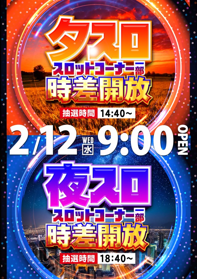 2月12日(水)9時開店! 夕スロ&夜スロ!!!