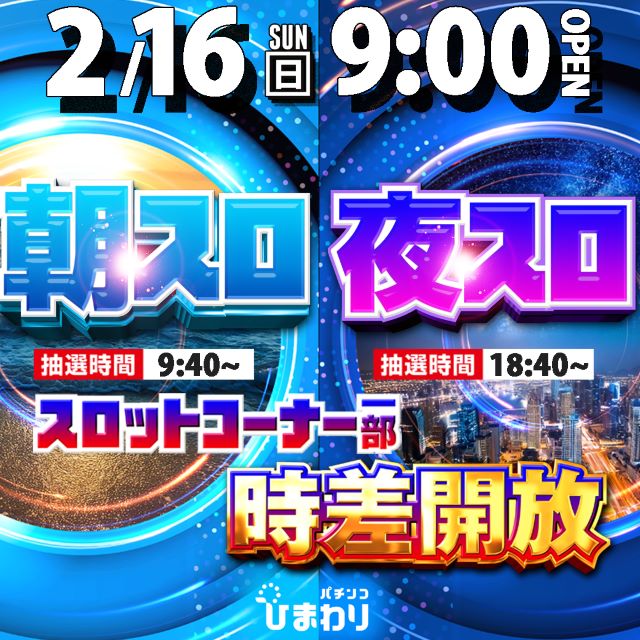 2月18日(火) 9時開店! 夕スロ&夜スロ時差開放!