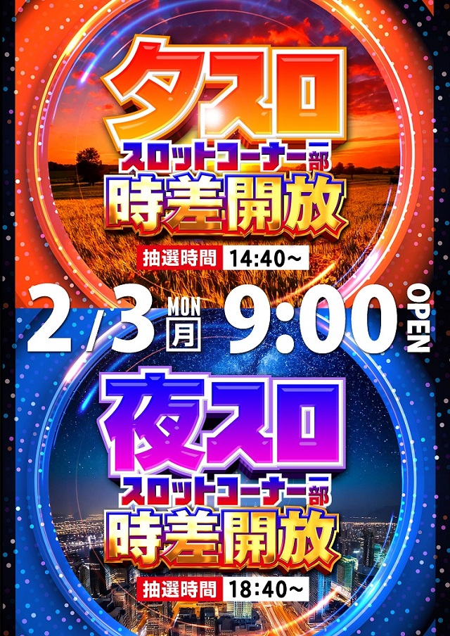 2月3日(月)9時開店!! ★夕スロ夜スロ★
