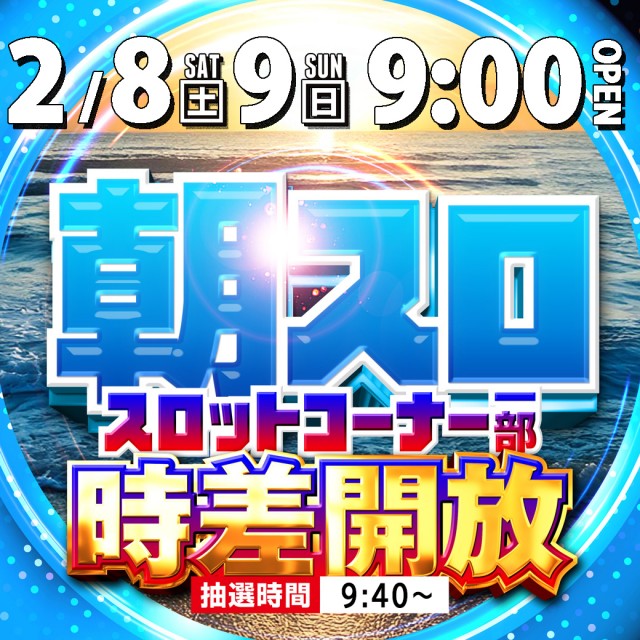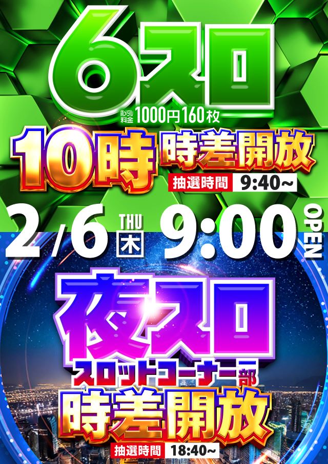 2月6日(木)9時開店!6スロ10時 時差開放!★夜スロ★