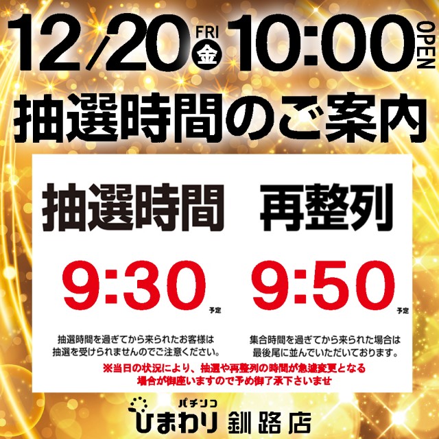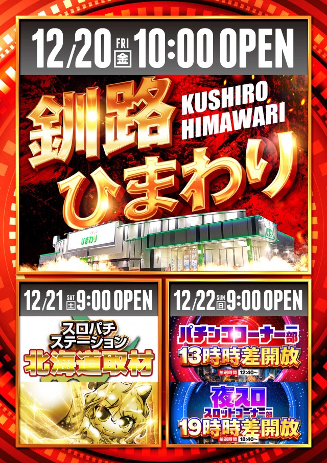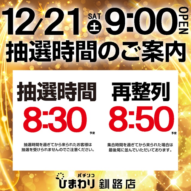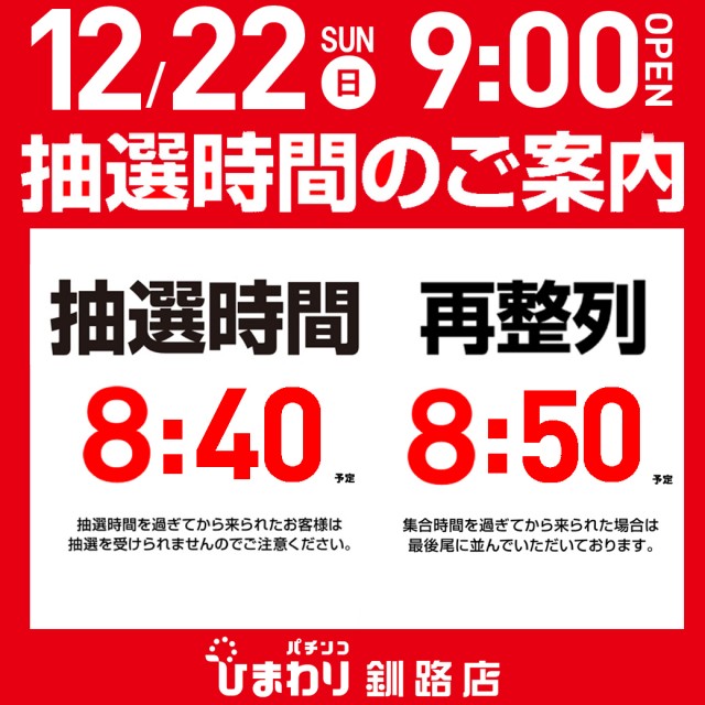 12月22日(日)パチンココーナー☆一部時差開放☆夜スロ☆