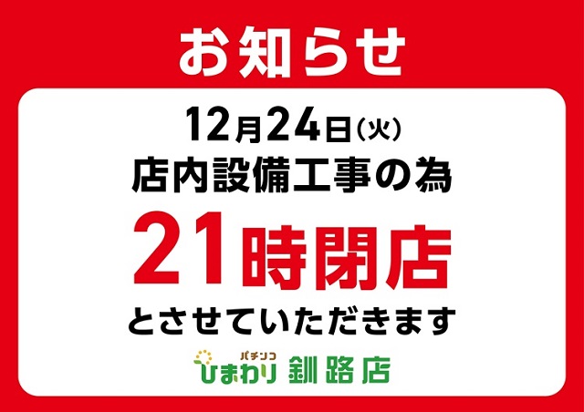 12月24日(火)9時00分開店!閉店時間変更のお知らせ