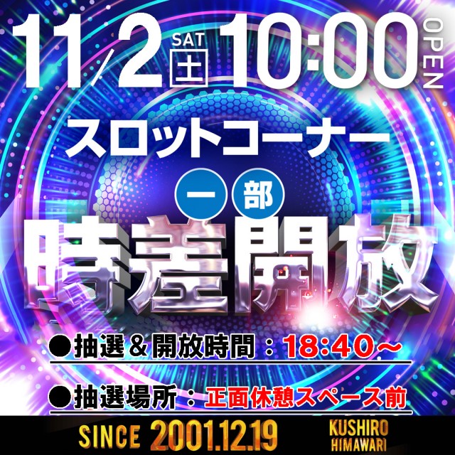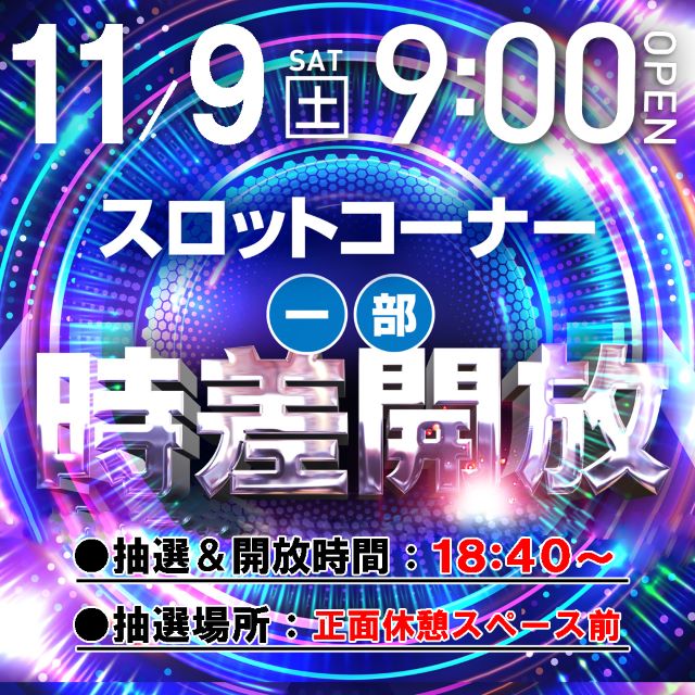 11月9日(土) ☆スロットコーナー☆ 一部時差開放!!