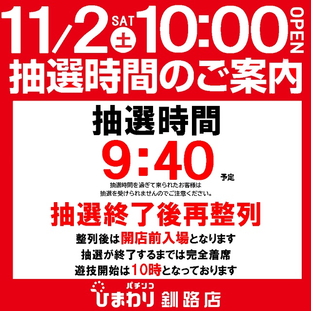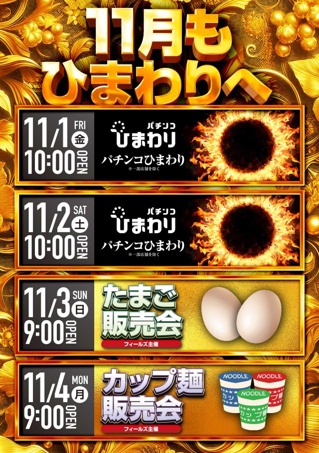 11月2日(土)北海道ひまわり10時00分開店!!